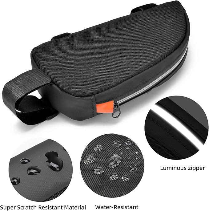 - 【SUPER LARGE CAPACITY】 – This top tube bike bag measures 8.85 * 1.96 * 3.94 inches and has large storage space. It can store mobile phones, keys, flashlights, wallets, cards, gloves, power banks, bike repair tools, and more, meeting your personal belongings needs when cycling outside.