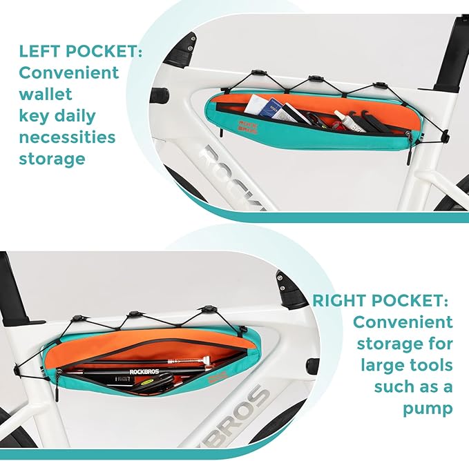 - [EASY TO INSTALL&RELEASE]: This front frame bag is designed with four buckles a one-piece elastic cord for quick and easy disassembly, and movable fixing port that allows you to adjust the position of the straps to suit your bike model.